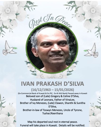 It is with profound sadness that we announce the passing of Ivan Prakash D'Silva, who departed this life peacefully on 15th January 2026 in Kuwait.