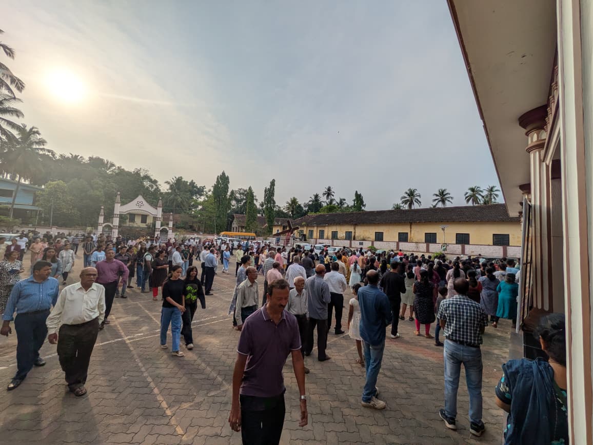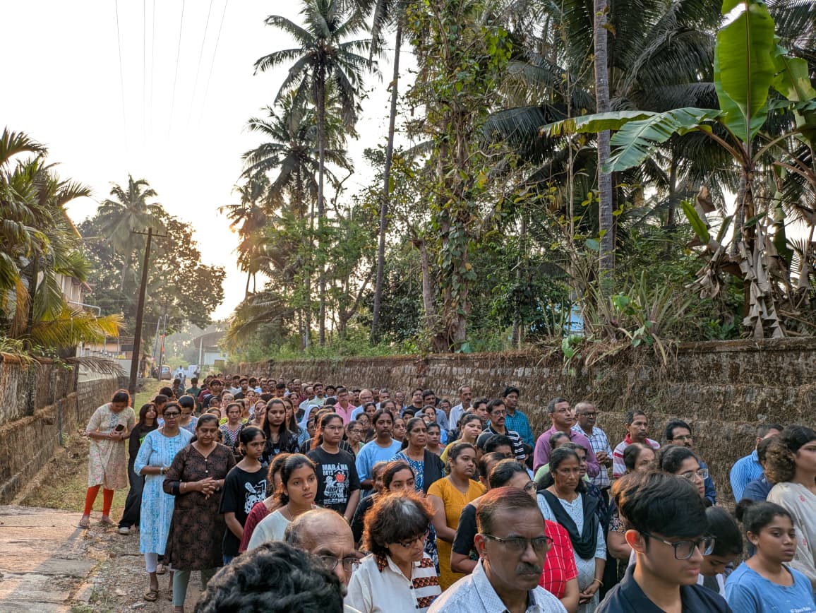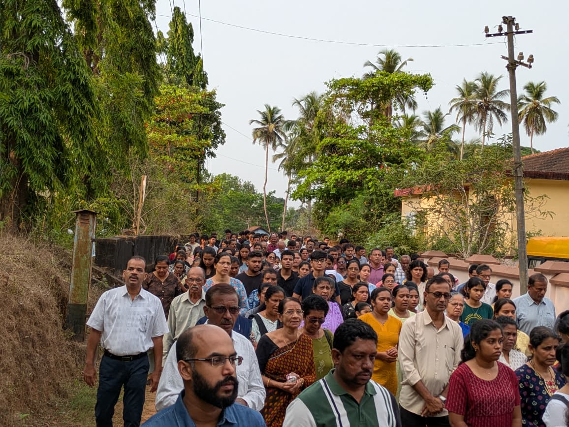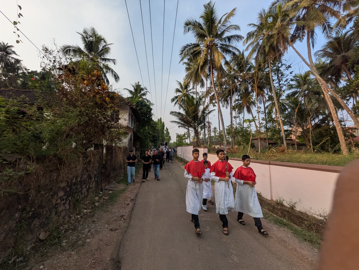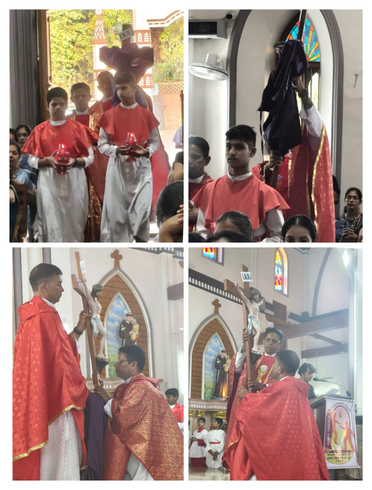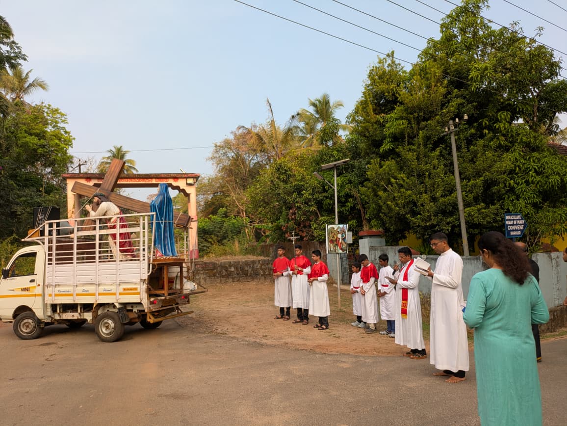 The day's observances began at 7 am with the Stations of the Cross, led by parish priest Fr. Ronald Miranda alongside guest priest Fr. Praveen Leo Lasrado. A procession re-enacting Christ's arduous journey to Calvary wound through the church compound, with Fr. Lasrado narrating the account of the Passion. The procession drew the attention of non-Christian residents in the vicinity, who watched with visible reverence and goodwill.