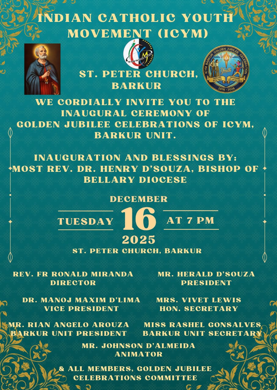 Barkur, December 2025 – The Indian Catholic Youth Movement (ICYM) Barkur Unit is preparing to mark a significant milestone as it completes 49 years since its establishment and steps into its 50th year. The unit will officially launch its Golden Jubilee Year celebrations with an inaugural ceremony on Tuesday, December 16, 2025, at 7:00 PM at St. Peter Church, Barkur.