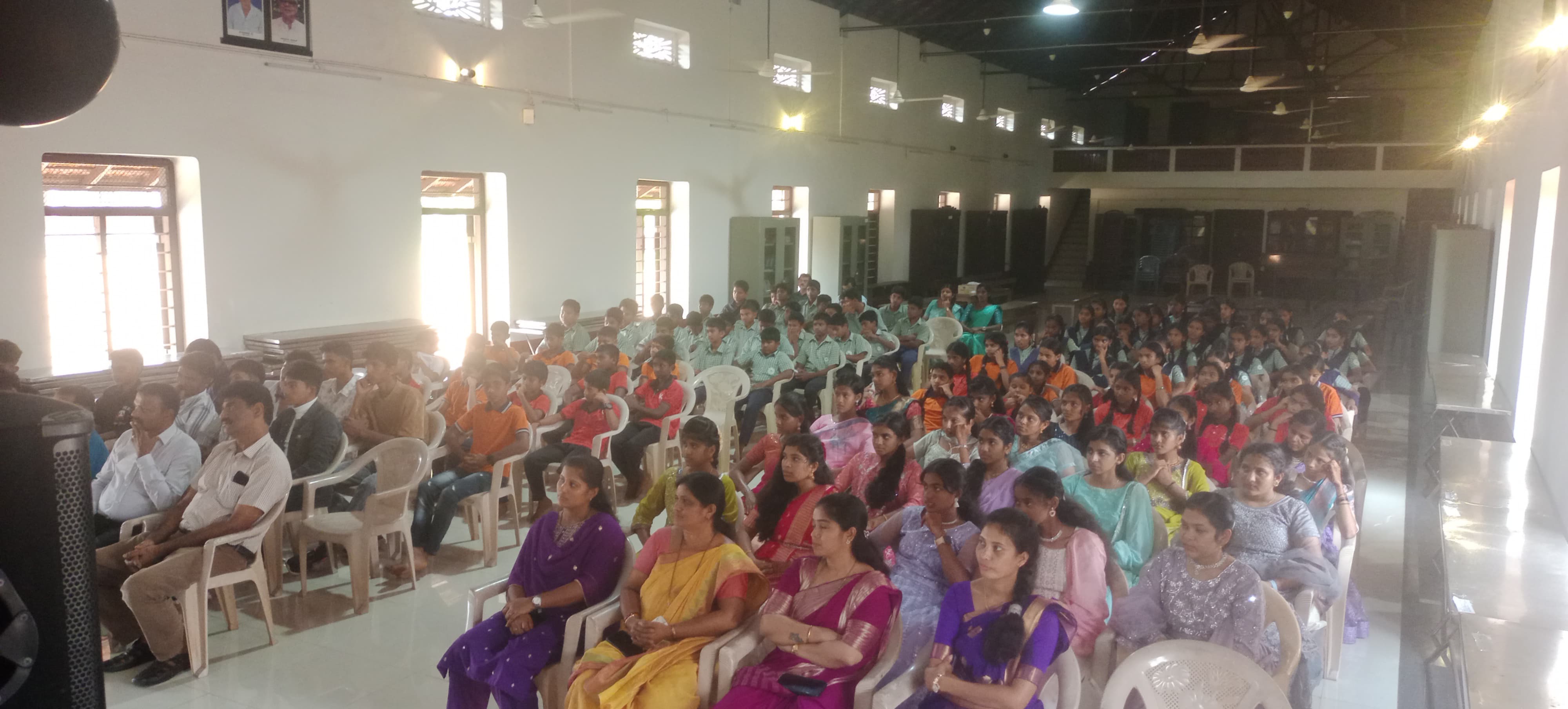At 2:15 p.m., a group of teachers led by senior teacher Mrs. Hemavathi P. S. escorted Mrs. Jyothi Shetty, the central figure of the Guru Vandana programme, into the library hall. As she entered, all the students gathered in the hall stood up and greeted her with deep respect.