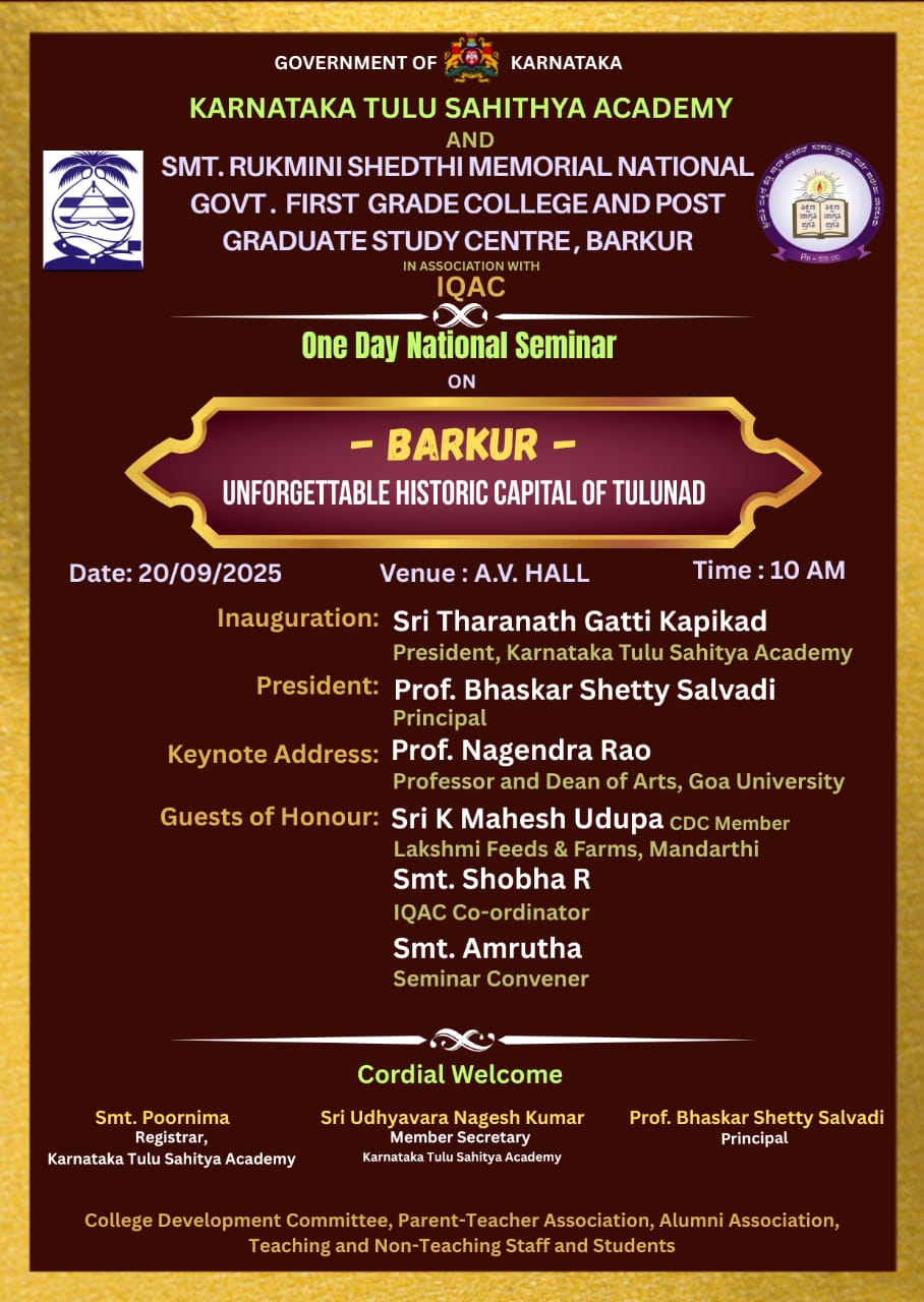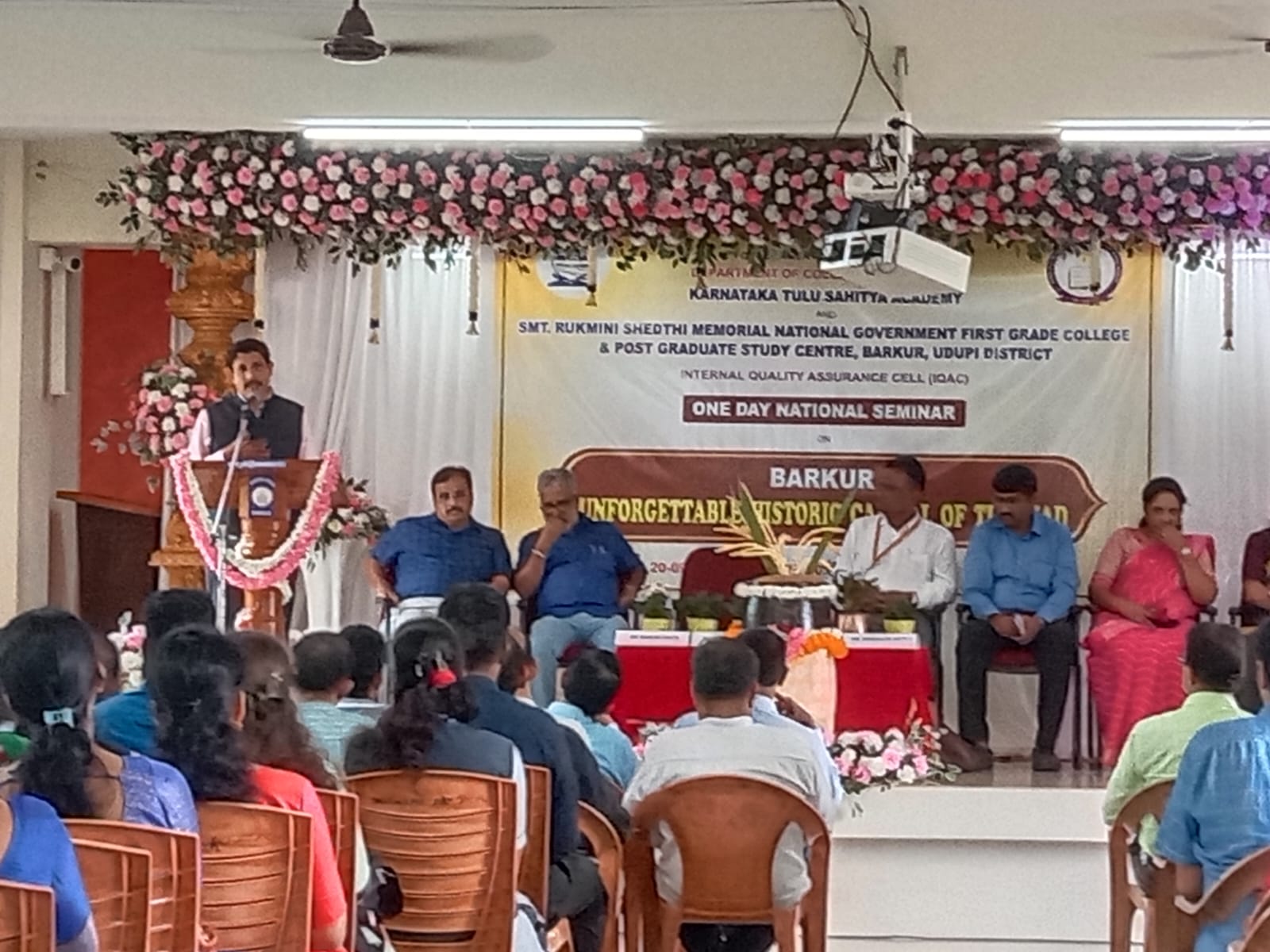 The Karnataka Tulu Sahitya Academy, in partnership with Smt. Rukmini Shedthi Memorial National Government First Grade College and Post Graduate Study Centre, Barkur, and its Internal Quality Assurance Cell (IQAC), successfully conducted a one-day national seminar titled "Barkur – Unforgettable Historic Capital of Tulunad" on Saturday, September 20th, 2025. The event took place at the College A.V. Hall, drawing together scholars, academicians, students, and dignitaries to explore the rich historical legacy of this ancient Tulunad capital.