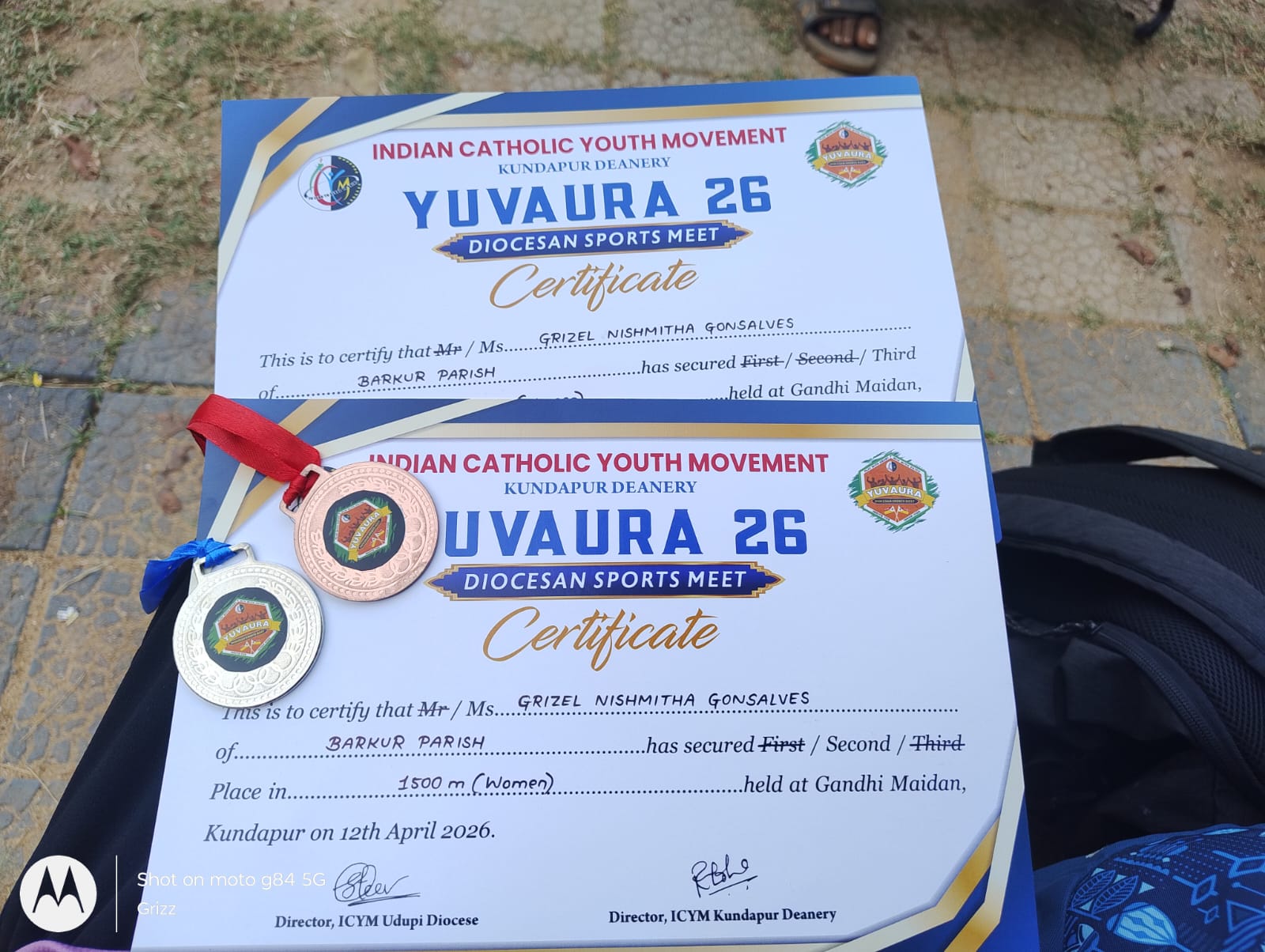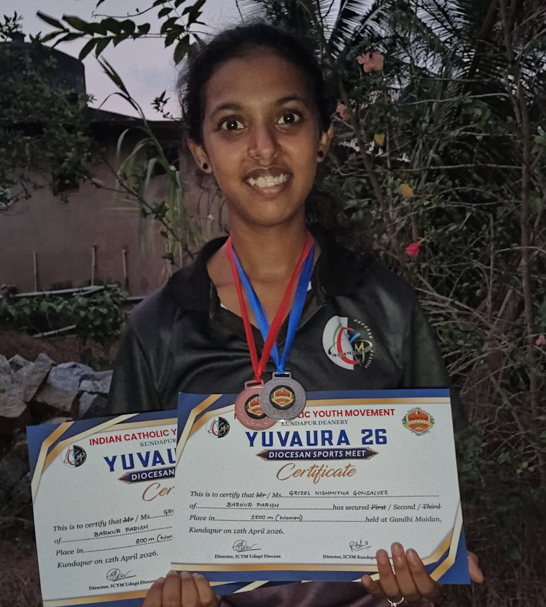 Kundapur, April 12, 2026 — Barkur's Nishmitha Gonsalves turned heads at this year's Deanery Level Sports Meet, YUVAURA 26, delivering a standout performance that earned her two medals across the track events.