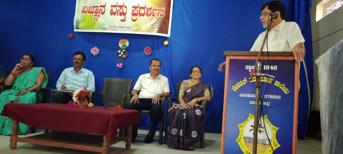 The exhibition was formally inaugurated at 11.00 a.m. with a symbolic scientific demonstration – igniting fire using potassium permanganate and glycerin by Mr. Archibald Furtado, Admn Coordinator of National Group of Educational Institutions, managed by The Barkur Educational Society – in the presence of Mrs. Hemavathy P. S., Headmistress of National High School, Mr. Udaya Shetty, Headmaster of National Primary School, Hanehalli, staff members, lecturers, and an enthusiastic student community as Mr. Maruti, Kannada Teacher, briefly introduced the objectives of the programme.