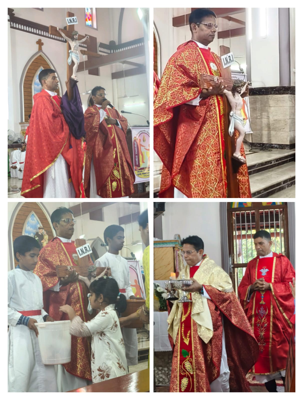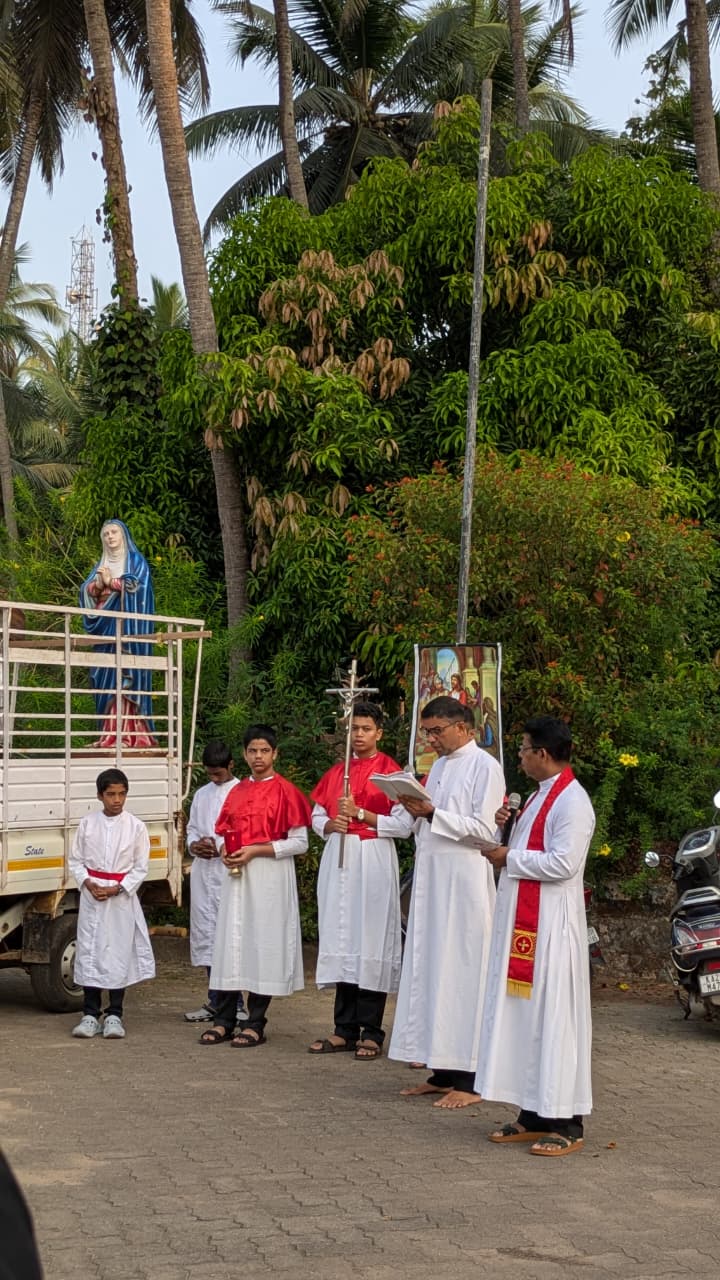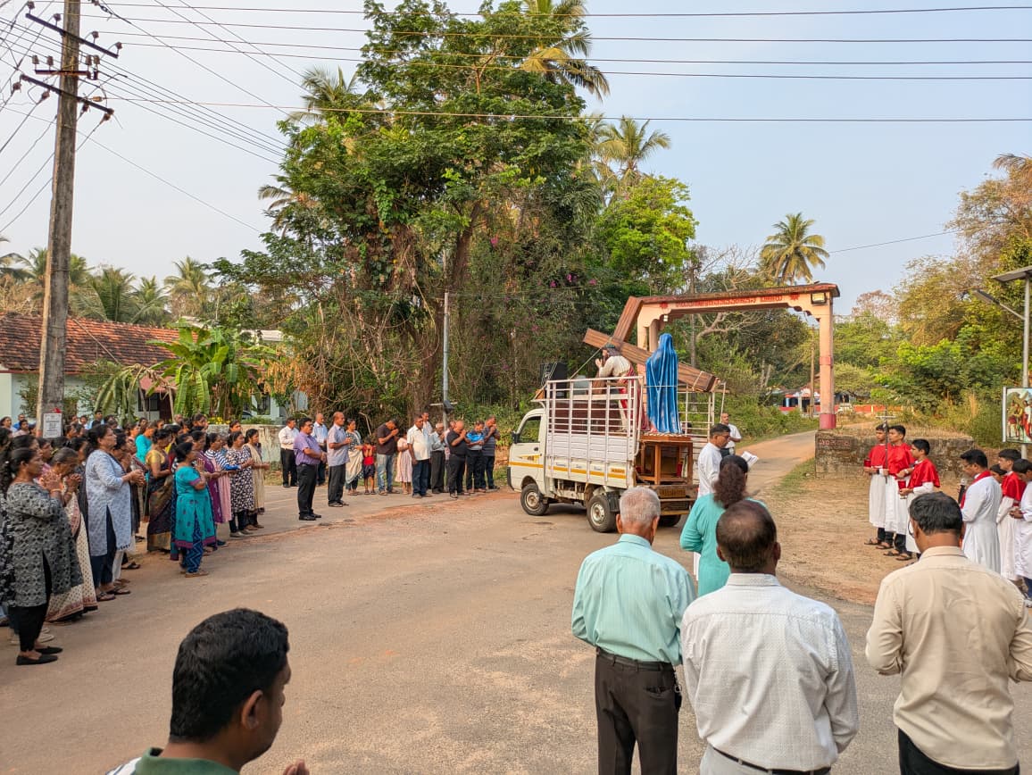 The day's observances began at 7 am with the Stations of the Cross, led by parish priest Fr. Ronald Miranda alongside guest priest Fr. Praveen Leo Lasrado. A procession re-enacting Christ's arduous journey to Calvary wound through the church compound, with Fr. Lasrado narrating the account of the Passion. The procession drew the attention of non-Christian residents in the vicinity, who watched with visible reverence and goodwill.