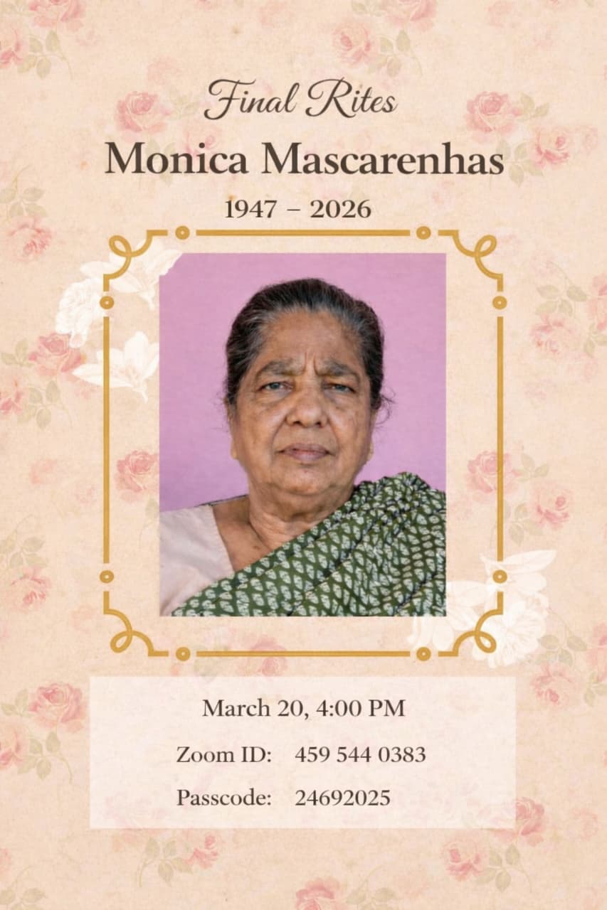 Wife of the late Peter Mascarenhas passed away on 19/03/2026. Funeral ceremony will be held on March 20 at 4:00 PM at Brother Rocky Mascarenhas’ residence in Barkur.
