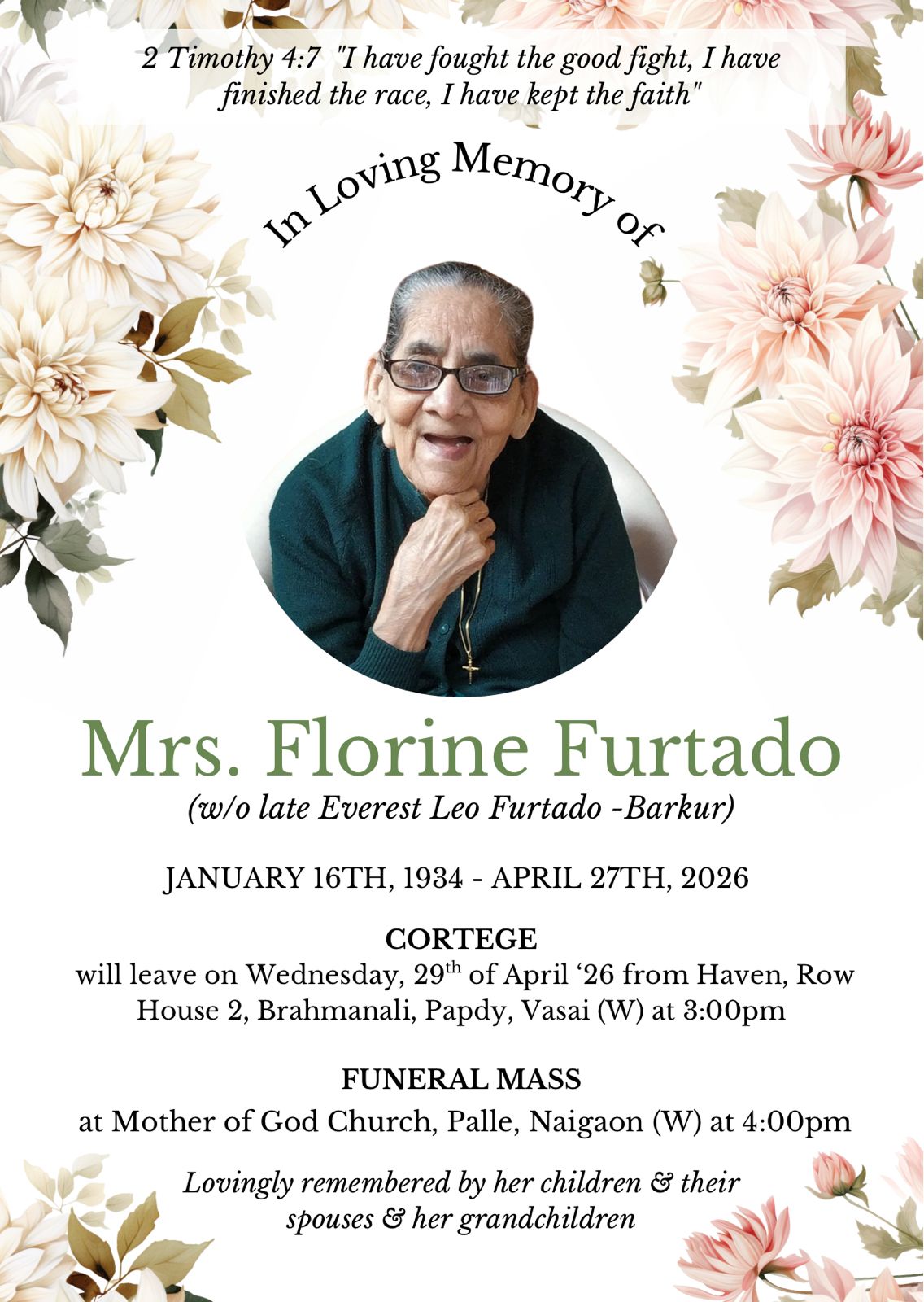 Funeral cortège will leave on Wednesday, 29th of April 2026 from Haven, Row House 2, Brahmanali, Papdy, Vasai (W) at 3:00 pm, for Funeral mass, at Mother of God Church, Palle, Naigaon (W) at 4:00 pm.
