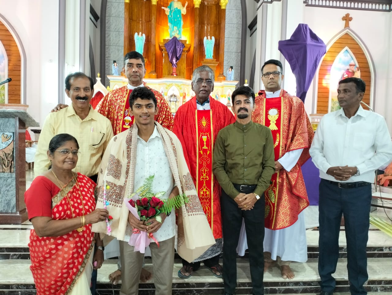 BARKUR, April 14, 2025 - The St. Peter's Church in Barkur witnessed a momentous occasion yesterday as the parish community came together to honor Jeston Dias, who recently secured the 9th rank at the state level in Karnataka's Pre-University Course (PUC) second-year science stream examinations. The felicitation ceremony was conducted following the Palm Sunday Mass, adding spiritual significance to the celebration of academic excellence.