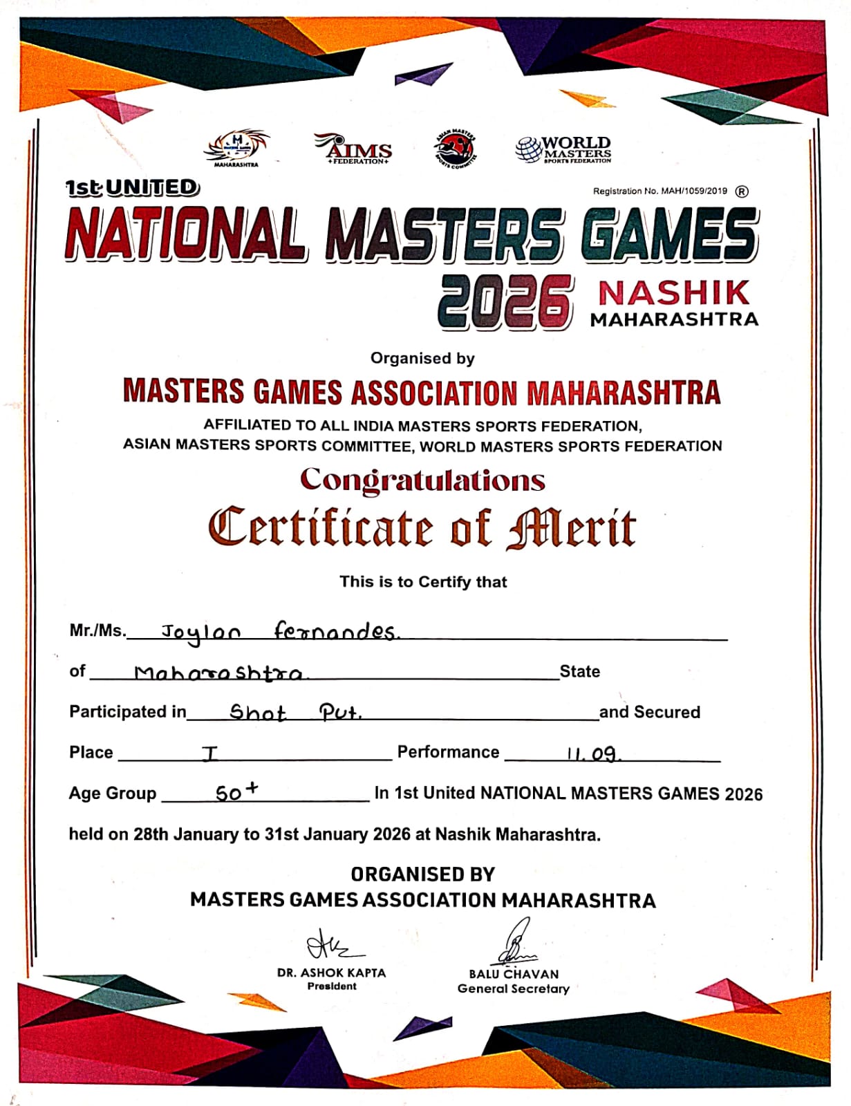 In the fiercely contested 50+ age category, Fernandes unleashed a measured throw of 11.09 meters, securing the top position on the podium. The official Certificate of Merit from the organizers underscores his dominant performance and rightful claim to the national title.