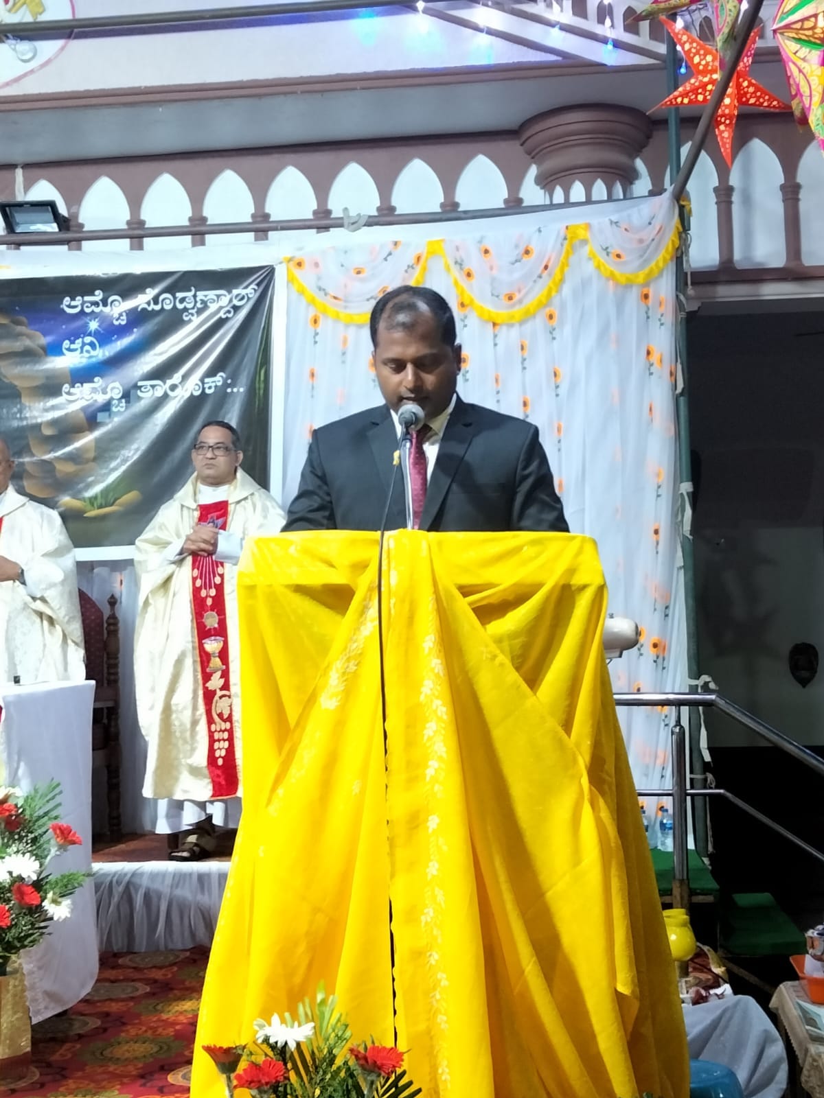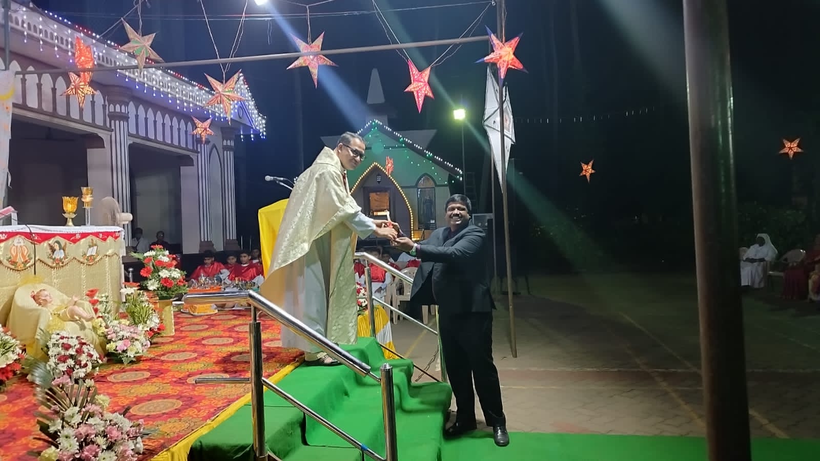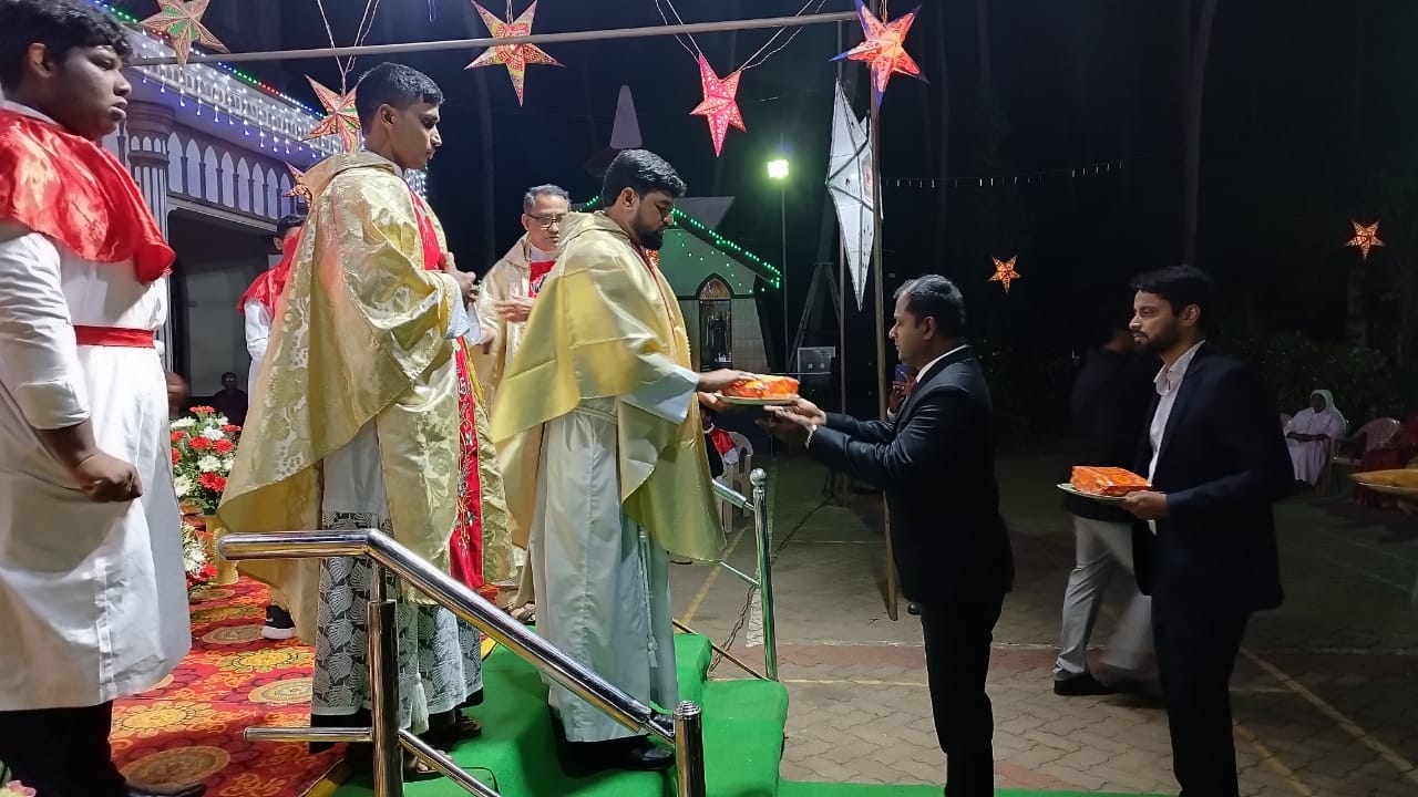'Naaikr Makkal', a WhatsApp group with 39 like minded adult men from and around Barkur was the center of attraction during the midnight Christmas mass at Barkur St.Peter Church, yesterday. The members were the Pirjenths of feast's high mass this year. The whole liturgy like the introduction, the readings, the psalm, the prayers of the faithful were read by the members. Almost all the members were part of the huge offertory procession. On behalf of the group Mr.Johnson Martis received the Pirjenth's candle by the Vicar Philip Neri Aranha. Vicar, in his announcement, appreciated group's unique thinking of sponsoring the Christmas Mass and adviced the mass gathering to follow this good deed. Over 850 devotees were served by Coffee and Samosas by the NM Group. To enhance the joy crackers were bursted, which made the gathering very happy.