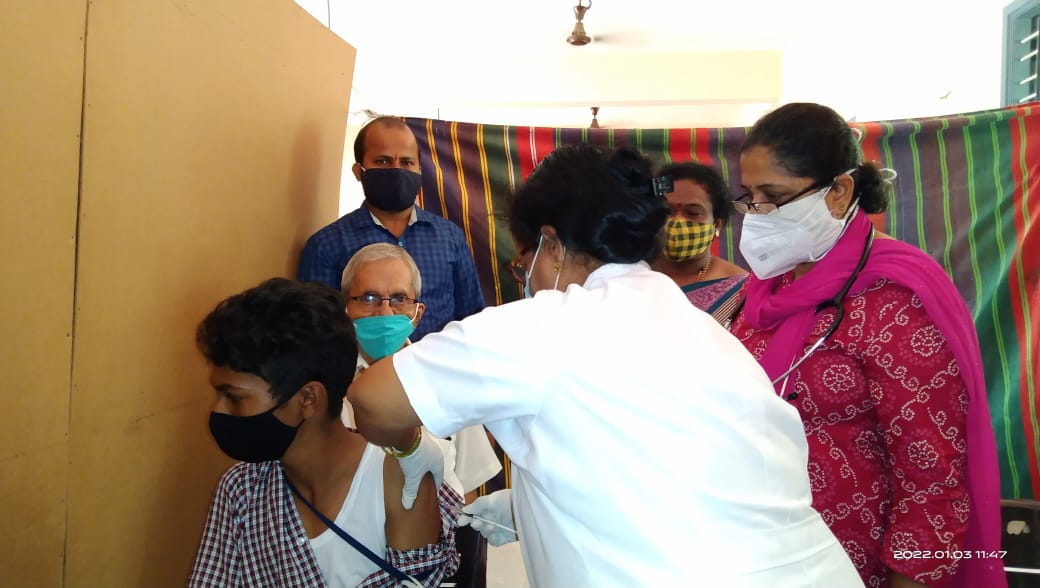 Free Vaccination Drive arranged at SVVN English Medium School, Herady Barkur, on 3rd January for the students of 14 and above the age. Dr Manjunath Somayaji, the correspondent of the school inaugurated the function by lighting the lamp and expressed his views on the vaccination. He opined that Indians naturally have good immunity still one cannot deny the risk. Along with the physical cleanliness, he stressed on the importance of mental and spiritual cleanliness too.