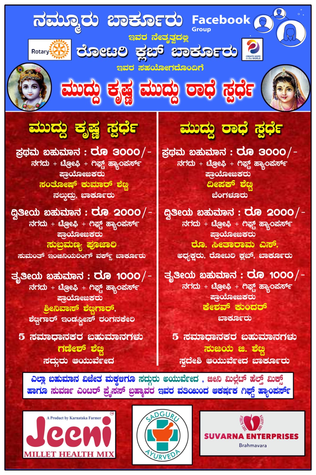 "Nammuru Barkuru" Facebook Group, with the support of the Rotary Club of Barkur, has initiated a unique photo contest to mark the occasion of Shri Krishna Janmashtami. The contest centers around the theme of "Little Krishna and Little Radha" and is being held in two separate categories. This time, esteemed judges will have the honor of selecting the winners.