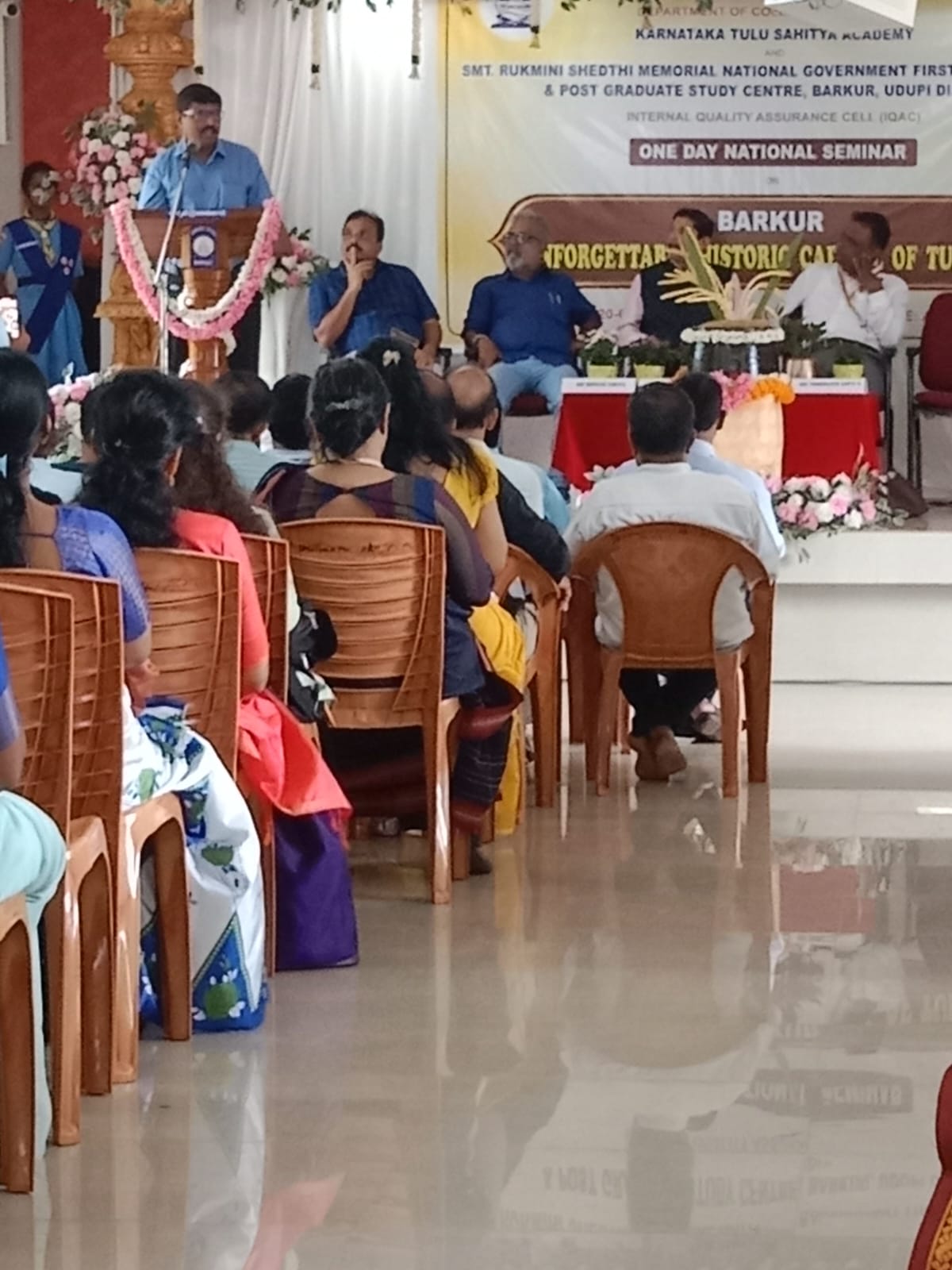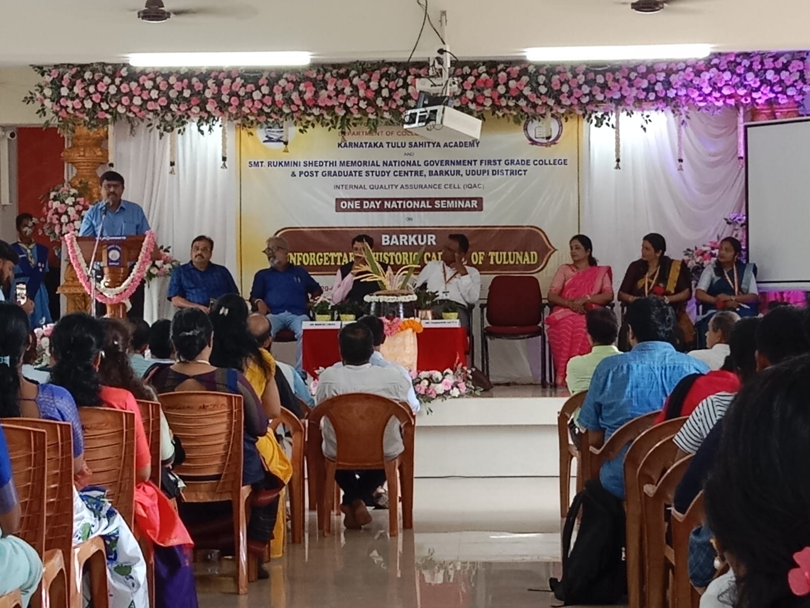 The Karnataka Tulu Sahitya Academy, in partnership with Smt. Rukmini Shedthi Memorial National Government First Grade College and Post Graduate Study Centre, Barkur, and its Internal Quality Assurance Cell (IQAC), successfully conducted a one-day national seminar titled "Barkur – Unforgettable Historic Capital of Tulunad" on Saturday, September 20th, 2025. The event took place at the College A.V. Hall, drawing together scholars, academicians, students, and dignitaries to explore the rich historical legacy of this ancient Tulunad capital.