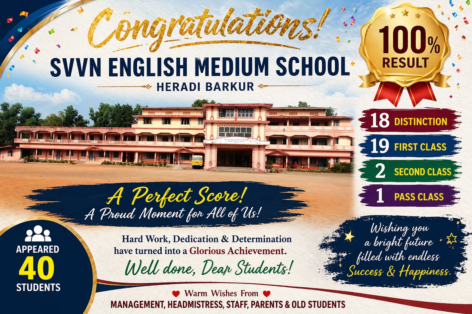 Behind every gleaming result card is an army of dedicated educators who give far more than their working hours. Special appreciation is due to Headmistress Mrs. Hemavathy P.S. of National High School and Principal Mrs. Likhita Kothari of SVVN English Medium School, whose vision, discipline and care have shaped these outcomes year after year.