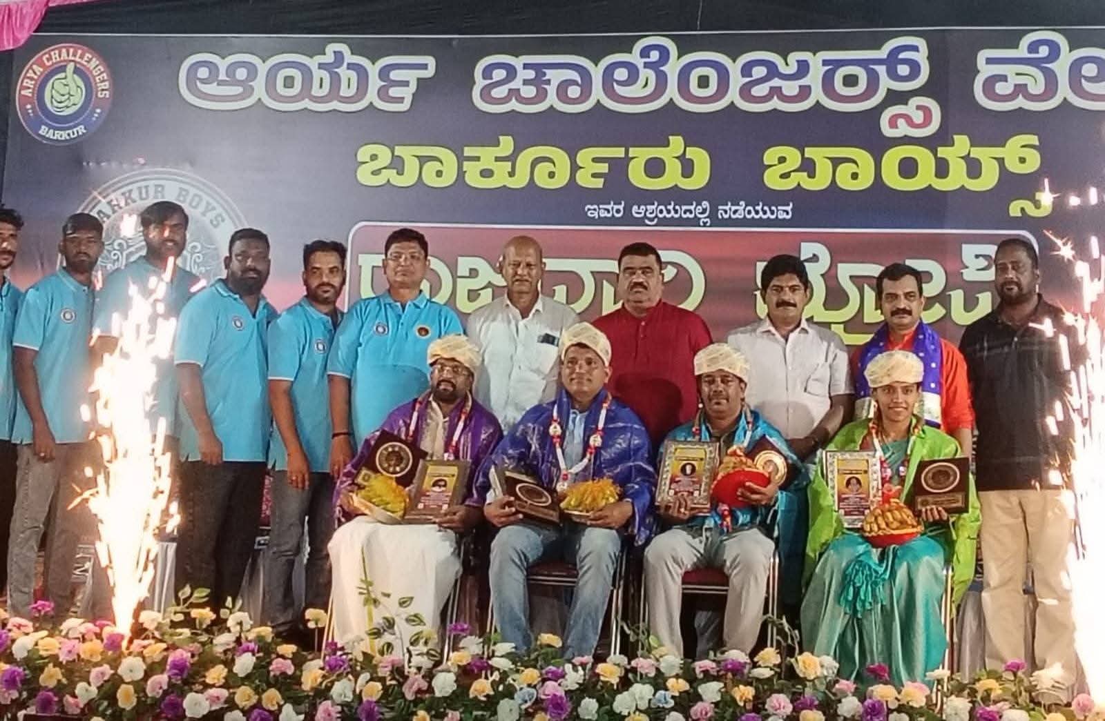 Barkuru – A special felicitation ceremony was organized at the Arya Challengers platform during the ongoing Rajdhani Trophy 2025, held under the patronage of Barkuru Boys at Simhasana Gudde Grounds. The event recognized and honored accomplished individuals from various fields for their remarkable achievements.