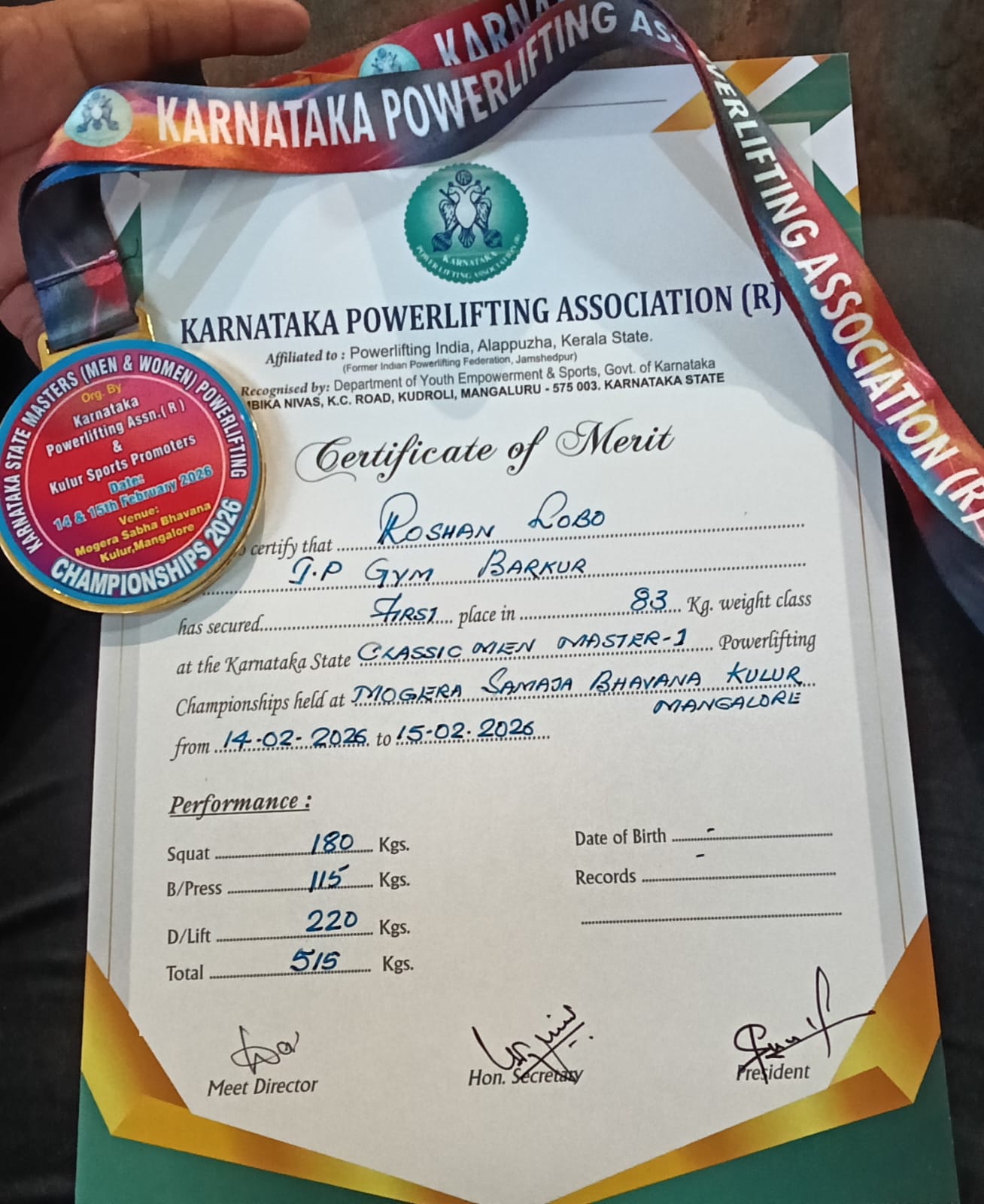 Mangalore, February 15, 2026 – In a stunning display of unyielding strength and resilience, 41-year-old powerlifter Roshan Lobo from Barkur has once again etched his name into Karnataka's sporting history. Over the weekend of February 14-15, Lobo dominated the Karnataka State Masters Powerlifting Classic Championship, securing a gold medal in the classic category, while also claiming a silver in the Equipped Powerlifting Championship. Both events unfolded at the Mogera Samaja Bhavana in Panijimogaru, Kulur, Mangalore, drawing crowds of enthusiastic supporters and fellow athletes who witnessed Lobo's masterful performance.