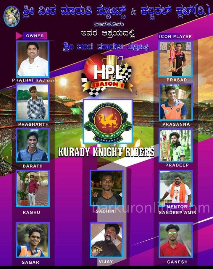 Team Barkur Sangam Khushi Cricketers owned by Sathosh Shetty, won the Shri Veeranmaruthu Trophy 2021 in the final match of Hanehalli Premier League 2021 40 yards Flood Light Cricket tournament organised by Shri Veeramaruthi Sports and Cultural Club. The tournament was held at Hanehalli School grounds.