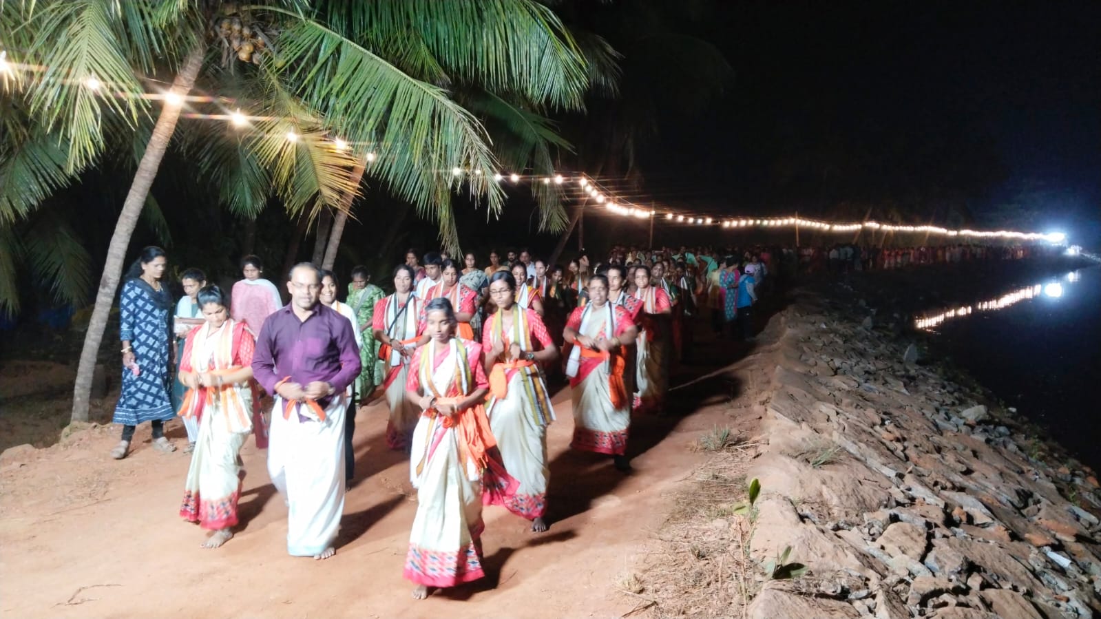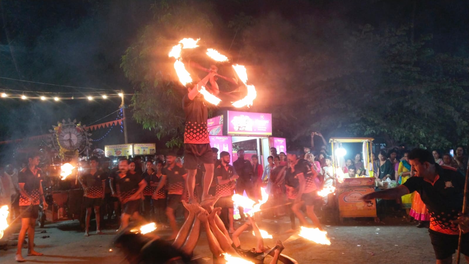 The magnificent procession  around the island featured renowned bhajan groups from across the district performing devotional dances, accompanied by the thunderous sounds of traditional drums and musical instruments. The celebration included an impressive display of fireworks, captivating puppet performances, and spectacular martial arts demonstrations.