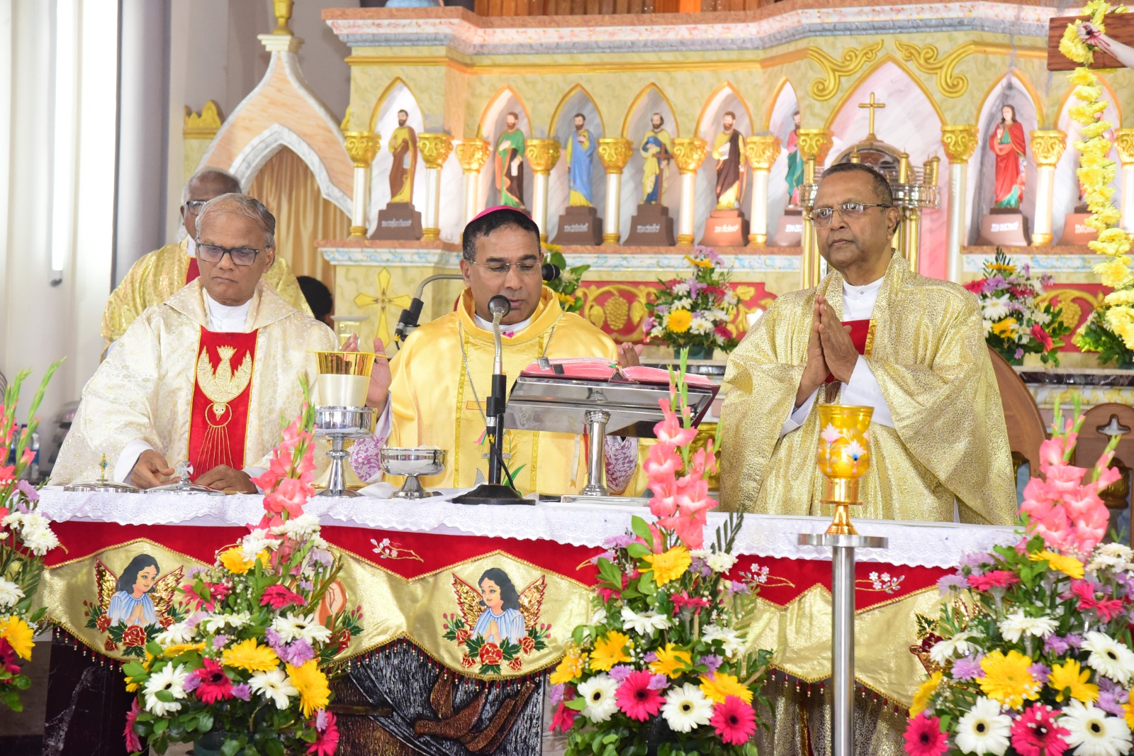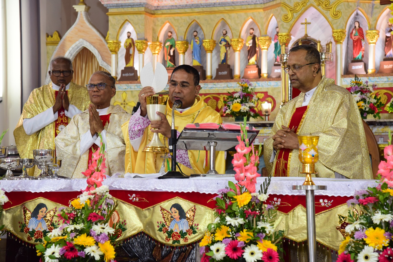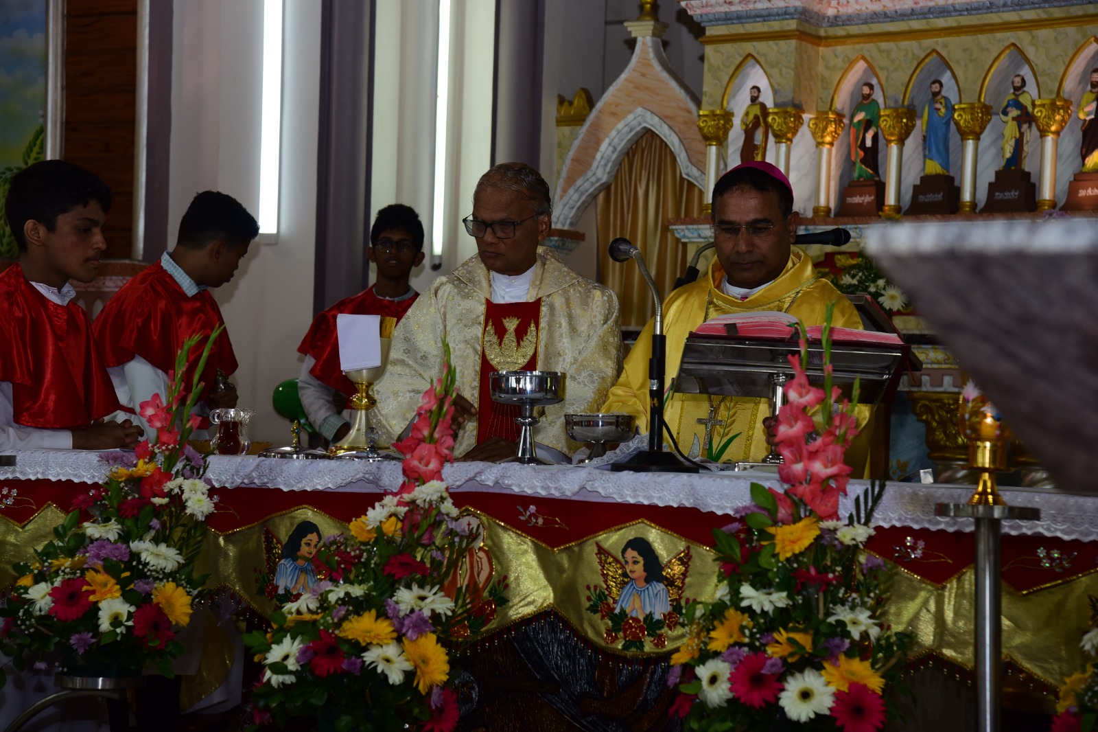 Rt. Rev. Dr. Duming Dais, Bishop of Karwar and Shimoga Diocese, served as the main celebrant of the solemn High Mass. The liturgical celebration was graced by the presence of Vicar General Rev. Fr. Ferdinand Gonsalves and numerous priests from the Kallianpur Deanery, who concelebrated the Mass alongside the Bishop.