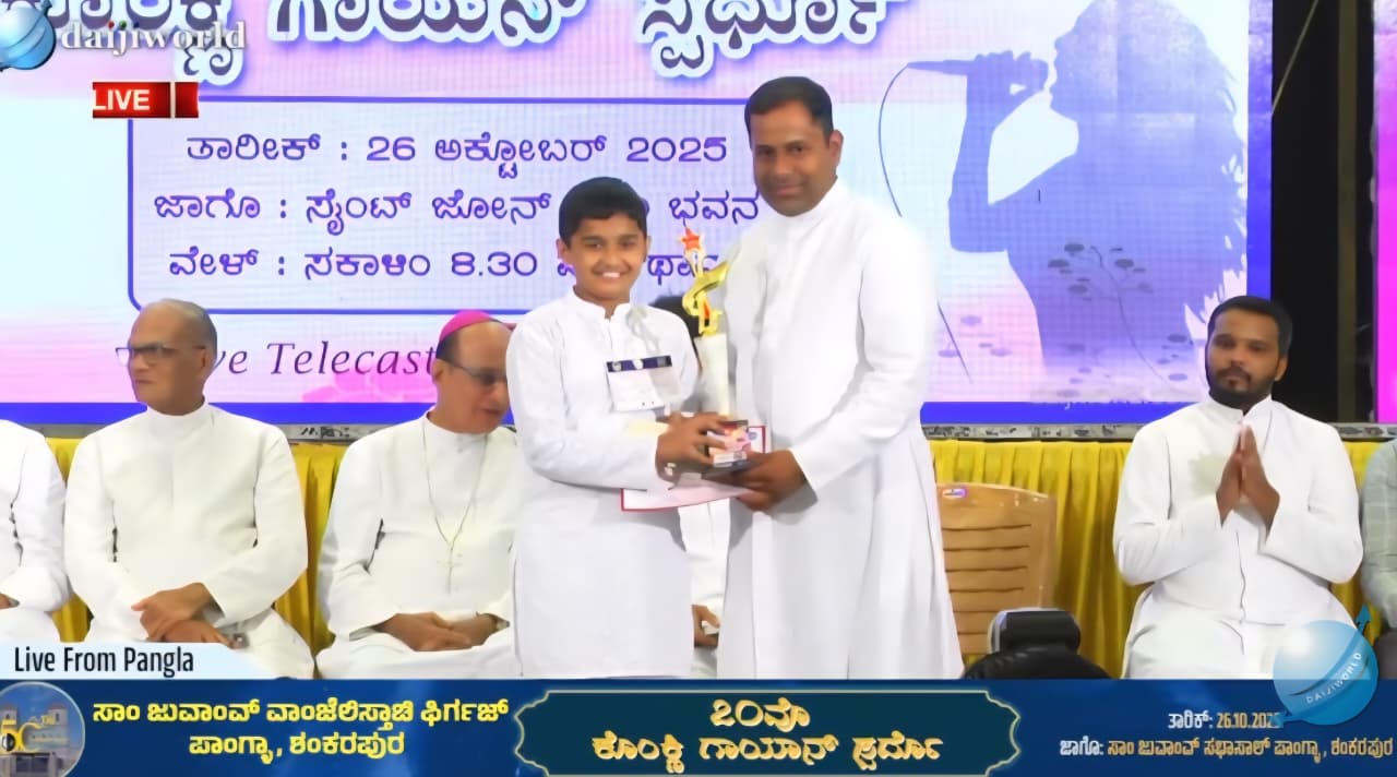 Udupi, October 26, 2025 – Gaurav John Carvalho from Kachchur, St. Peter's Ward, Barkur parish, brought glory to his parish by winning first prize in the under-10 years children's category at the diocese-level singing competition held in Pangla, Shankarpura today.